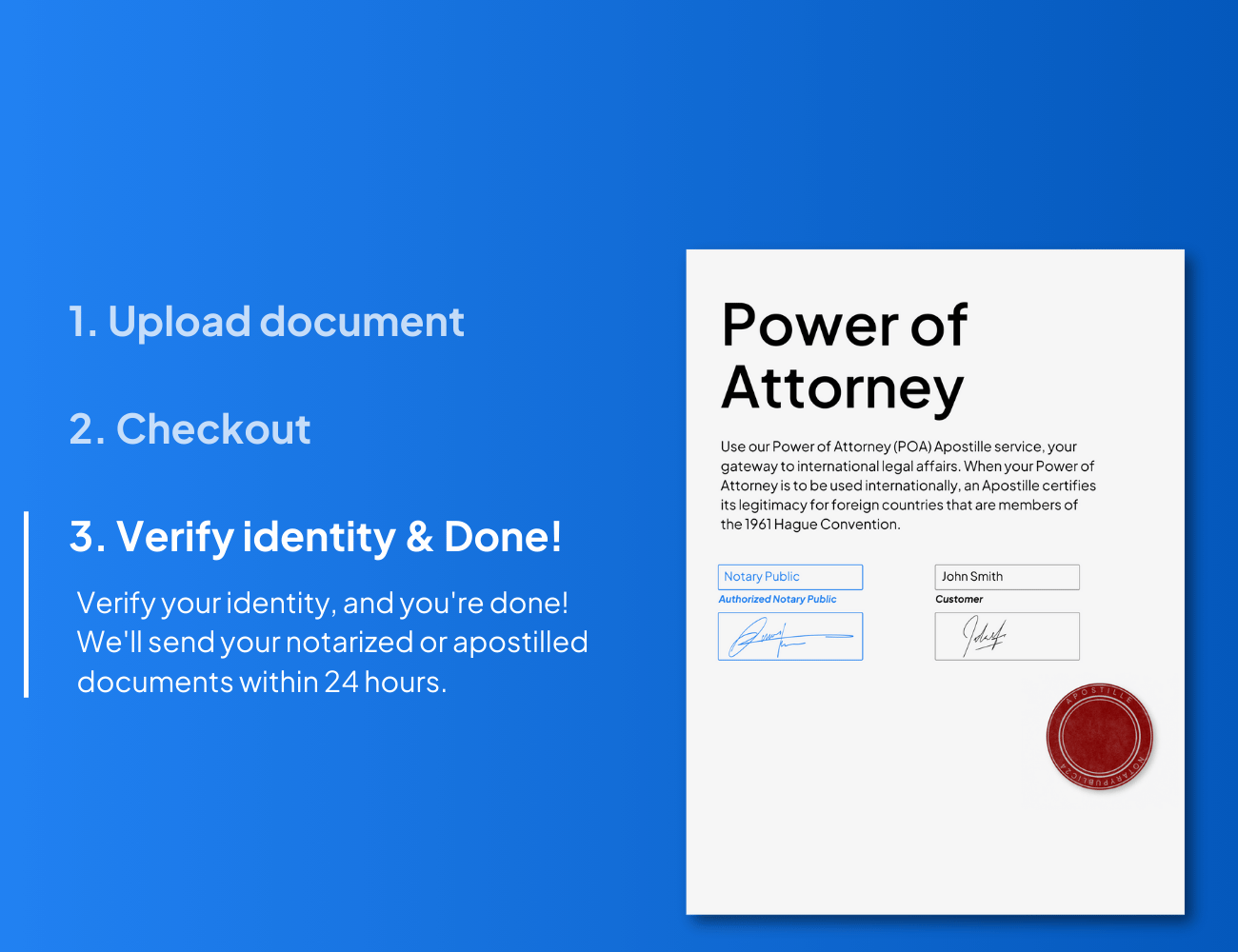 Verifique su identidad y ¡listo! Le enviaremos sus documentos notarizados o apostillados en 24 horas.