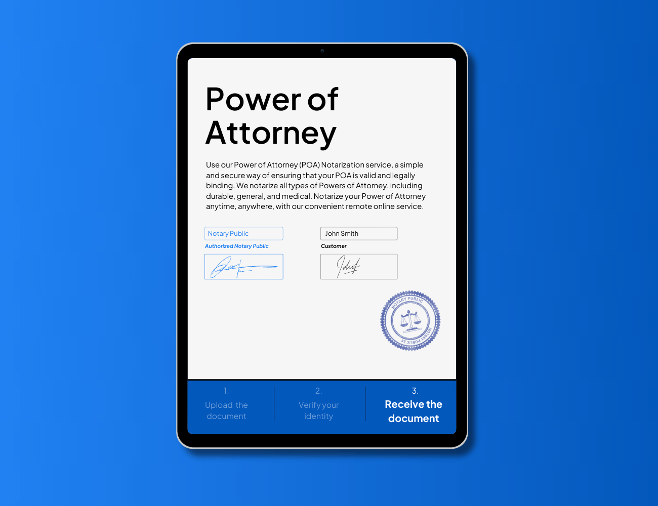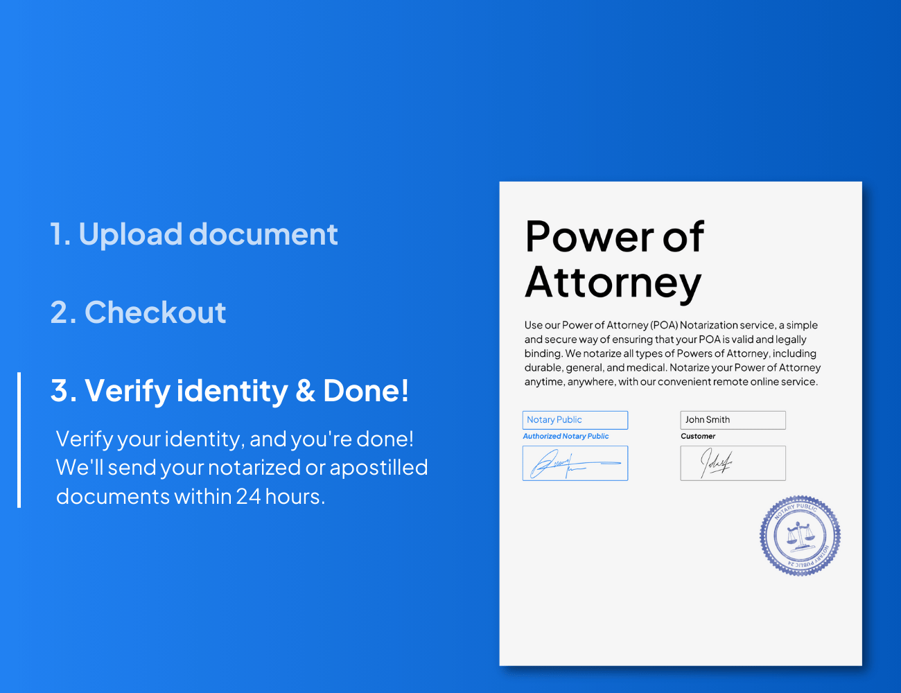 Notarizar un poder notarial es sencillo con NotaryPublic24. Solo tiene que subir su documento, completar el proceso de compra y verificar su identidad. Recibirá su poder notarial en 24 horas, ahorrándole el tiempo y el esfuerzo de buscar un notario local.